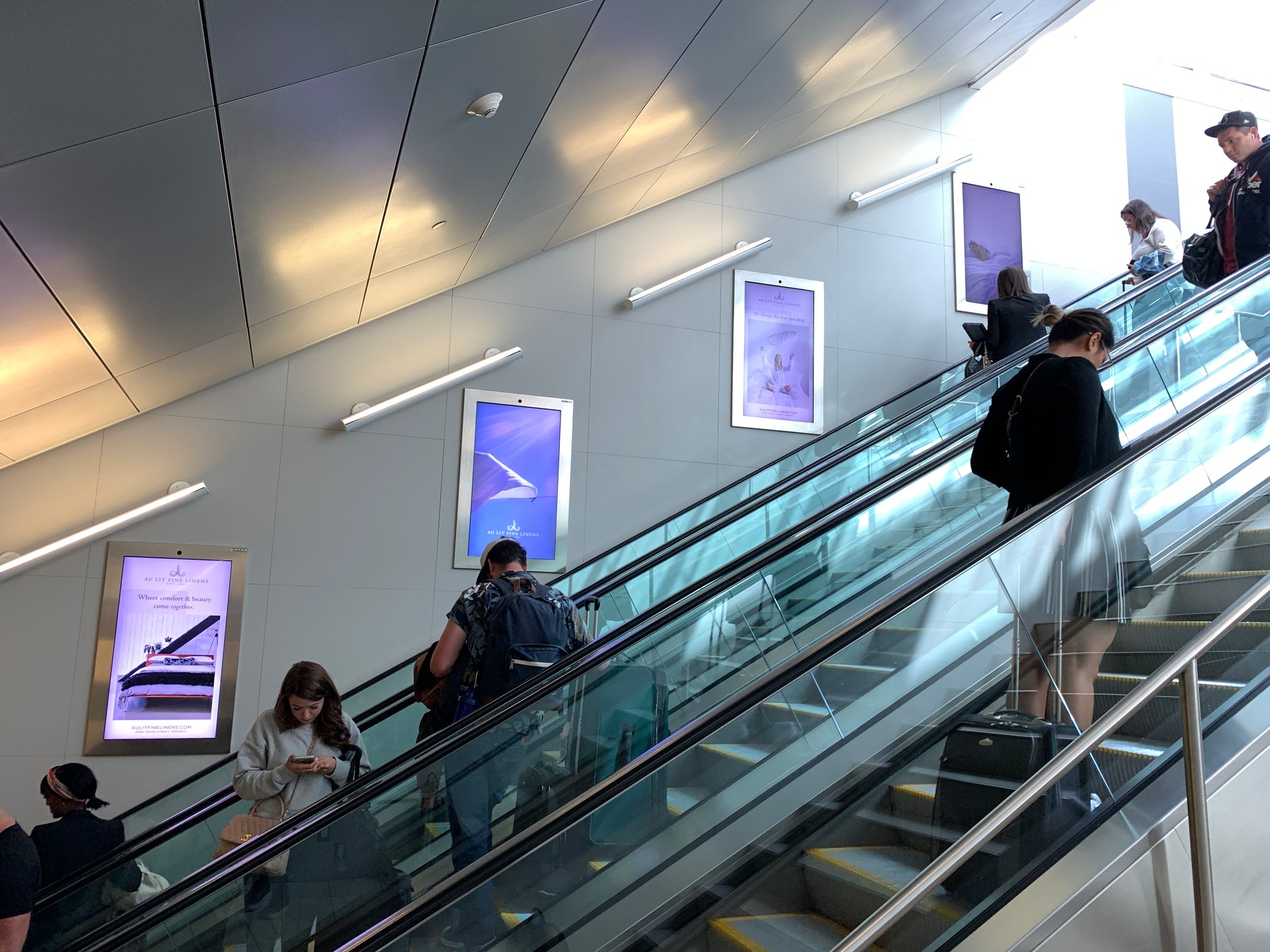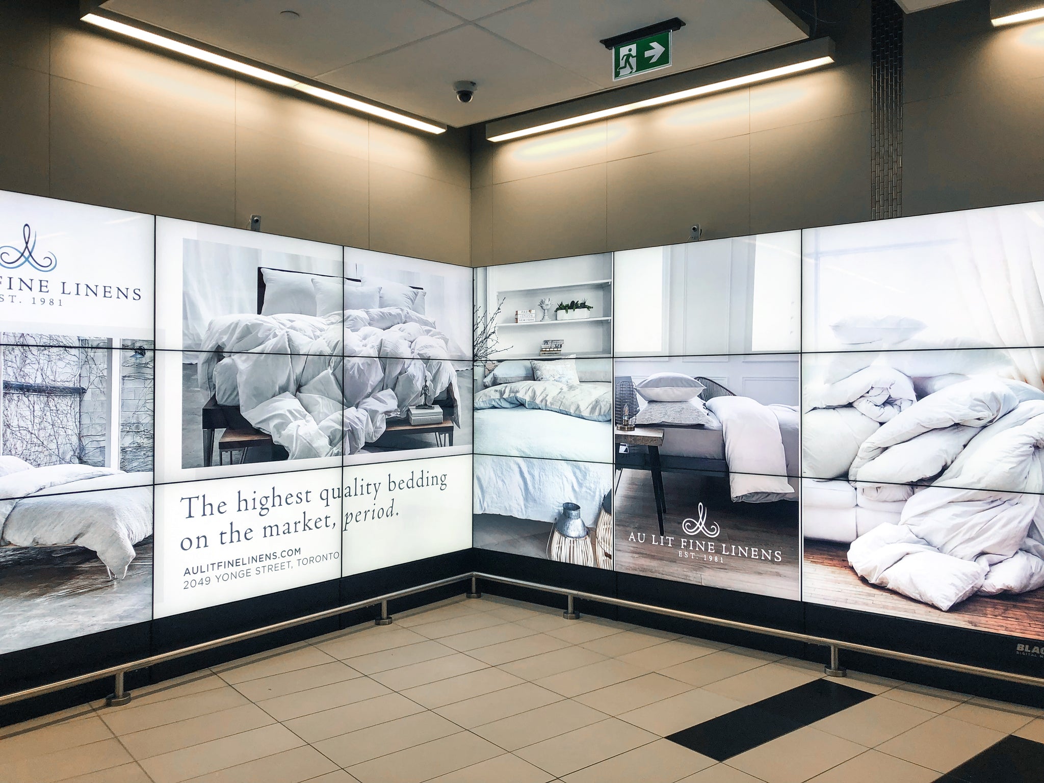 We know our clients are constantly on the go, so it seemed fitting to launch a campaign in Toronto’s very own Billy Bishop airport. Our eye-catching September display wrapped two walls and an escalator path and featured vibrant images and video clips of the linen-making process, from collecting cotton to sewing sheets. Here is an exclusive look at our September presentation: