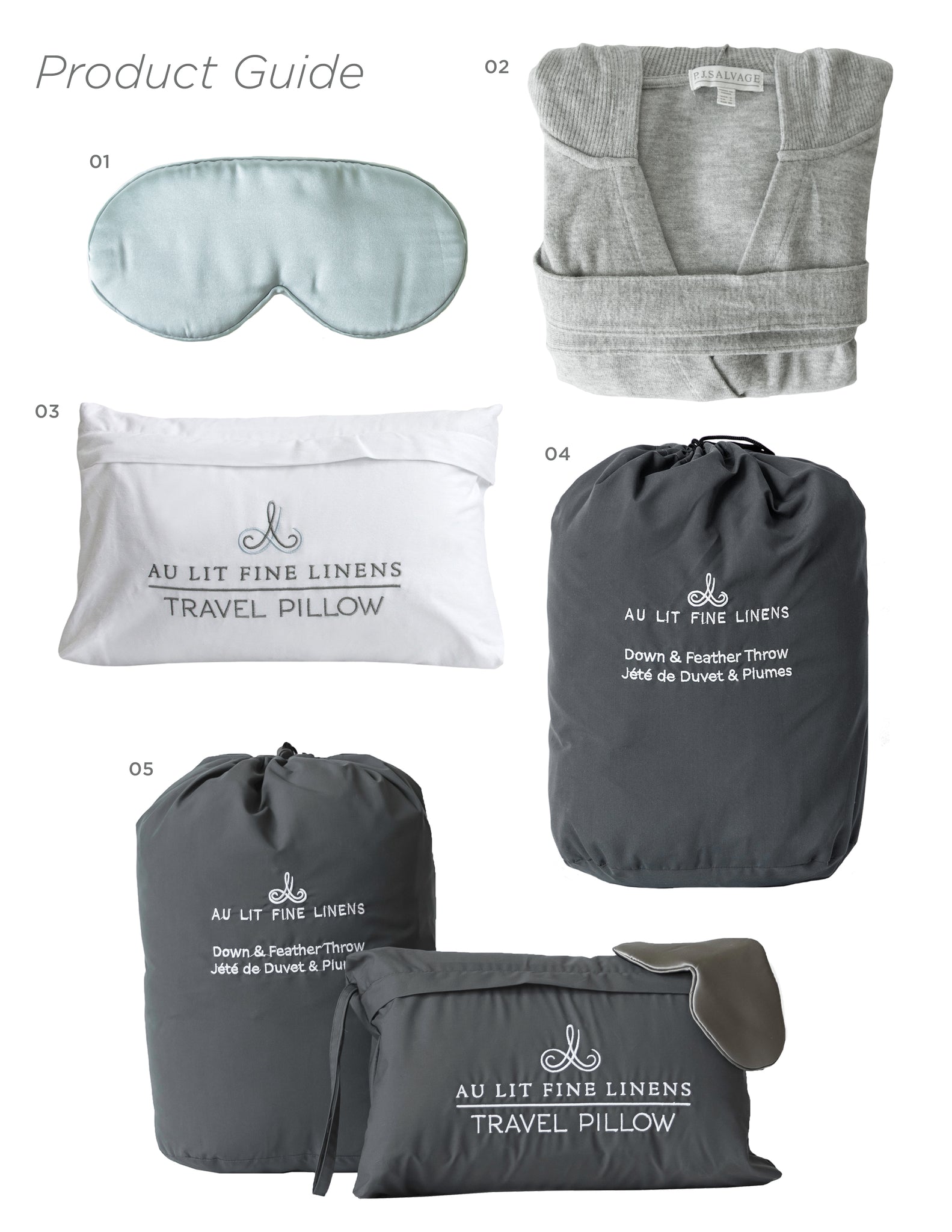 01 100% Silk Sleep Mask (in Blue) | 02 Peachy Dusters Melange Robe Heather Grey | 03 Travel Pillow White (also available in Grey) | 04 Down & Feather Travel Throw Grey | 05 Deluxe Travel Set