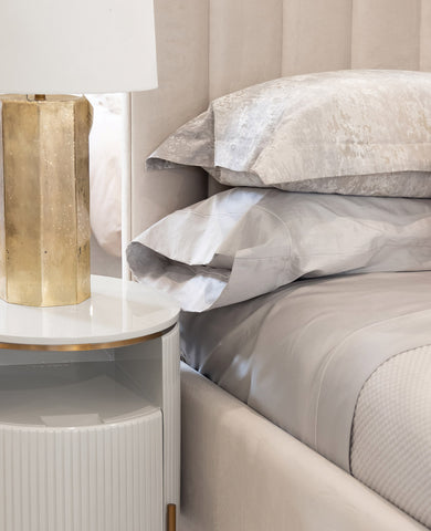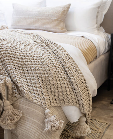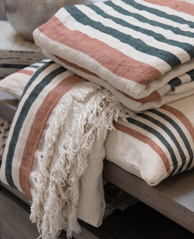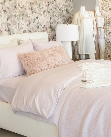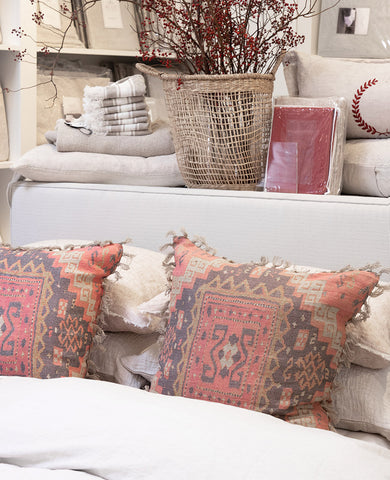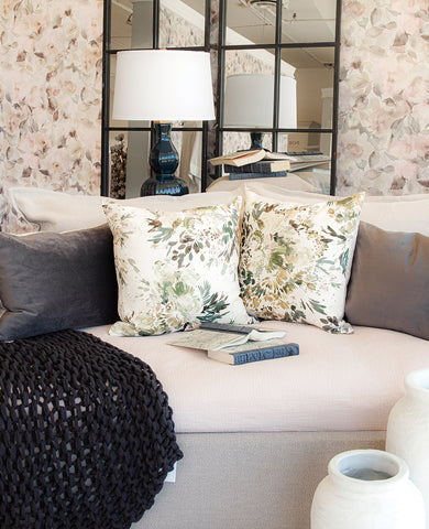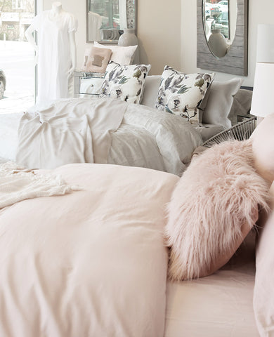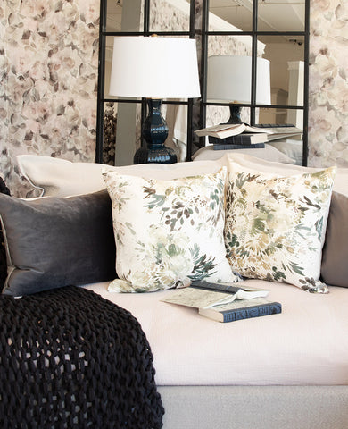 Our visual merchandisers have been dreaming up our summer window for months, and we're so proud to unveil it this long weekend. A palette of blush pink, soft grey, and charcoal are contrasted against a vintage watercolour floral background. Layers of textures complete the look: fluffy llama cushions, chunky knit throws, soft velvet pillows.