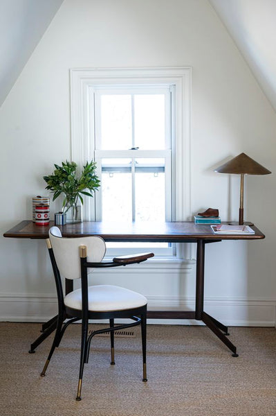 To add texture to the walls she used V-groove panelling, Brenlo custom wood mouldings, painted Benjamin Moore CC-40 cloud white. It’s a trick she uses a lot in her design work for clients in order to break up boring drywall. “Mine is four inches wide, but Brenlo will make it to any spec. We did it throughout the house to give back some of its original integrity,” she says. The ceiling height was another challenge. To make the room seem taller, Dimma put in a low-profile IKEA Malm bed with the light oak veneer. Then she covered the relatively inexpensive base with white linen, with a delicate cross-stitch, and part of her own capsule bedding collection with Au Lit Fine Linens. “I’m a big fan of linen,” she says. “I like that it’s relaxed and not fussy. You just have to embrace the wrinkles and accept them as an inherent part of the beauty of the fabric.” Then there was the alcove to contend with, another awkward, but interesting part of the space. At first, Dimma considered a daybed, with lots of colourful cushions, but then she remembered she had a vintage desk she had bought years ago and couldn’t part with. “It fits there perfectly and it’s where I do my writing and my billing,” says Dimma, who works from home. “It’s my favourite place. I look out onto green space and I feel like I’m sitting in the treetops.”